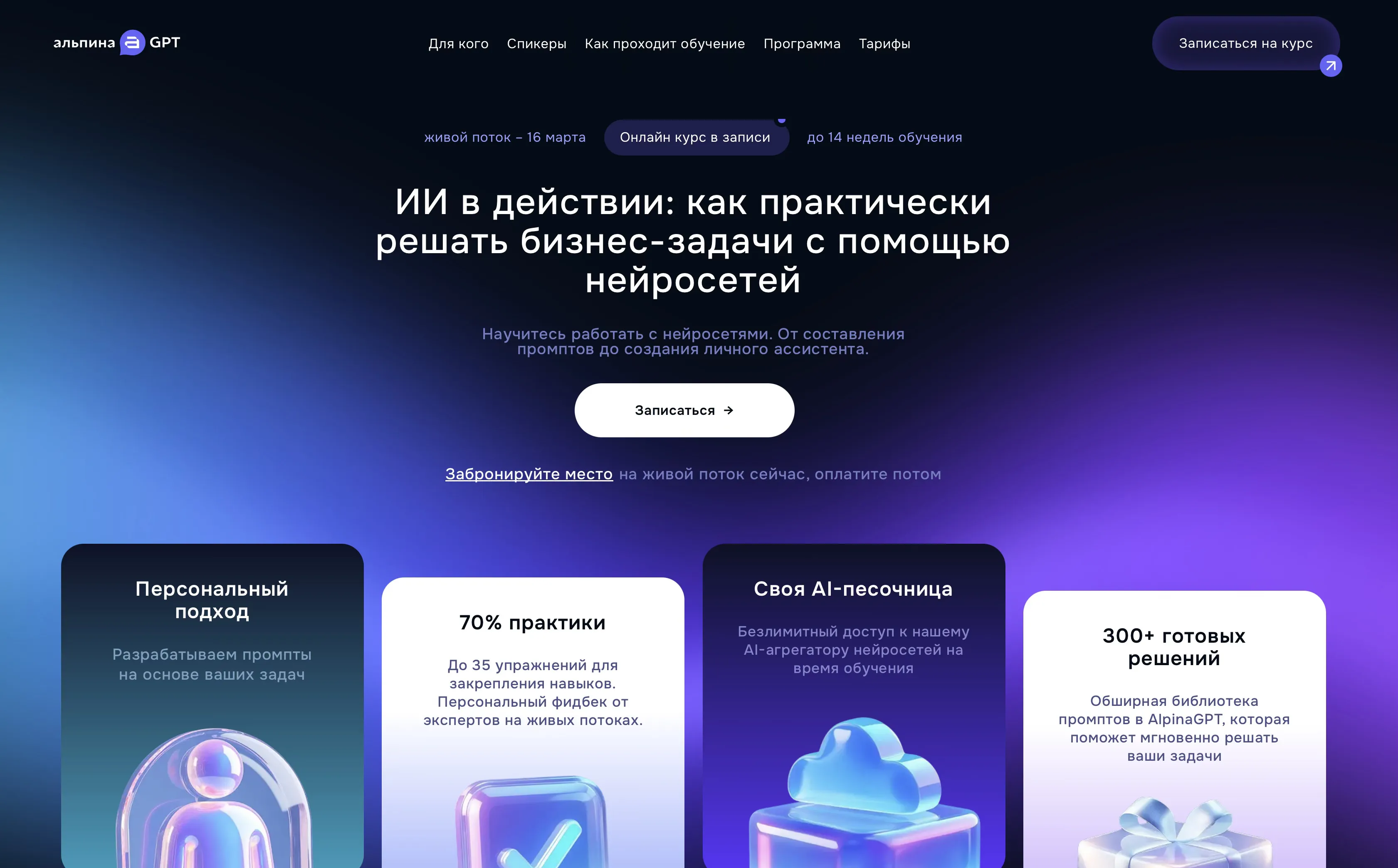 Лендинг для курса, где учат работать с нейросетями. Понятная структура, 70% занятий, своя AI-песочница на время обучения и библиотека из 300+ готовых промптов.