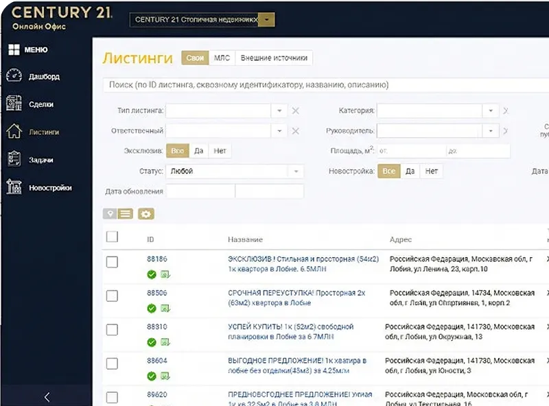 Реализованная CRM-система для крупного агентства недвижимости, где собраны листинги из своих и внешних источников, удобный поиск по ID, адресу и описанию.
